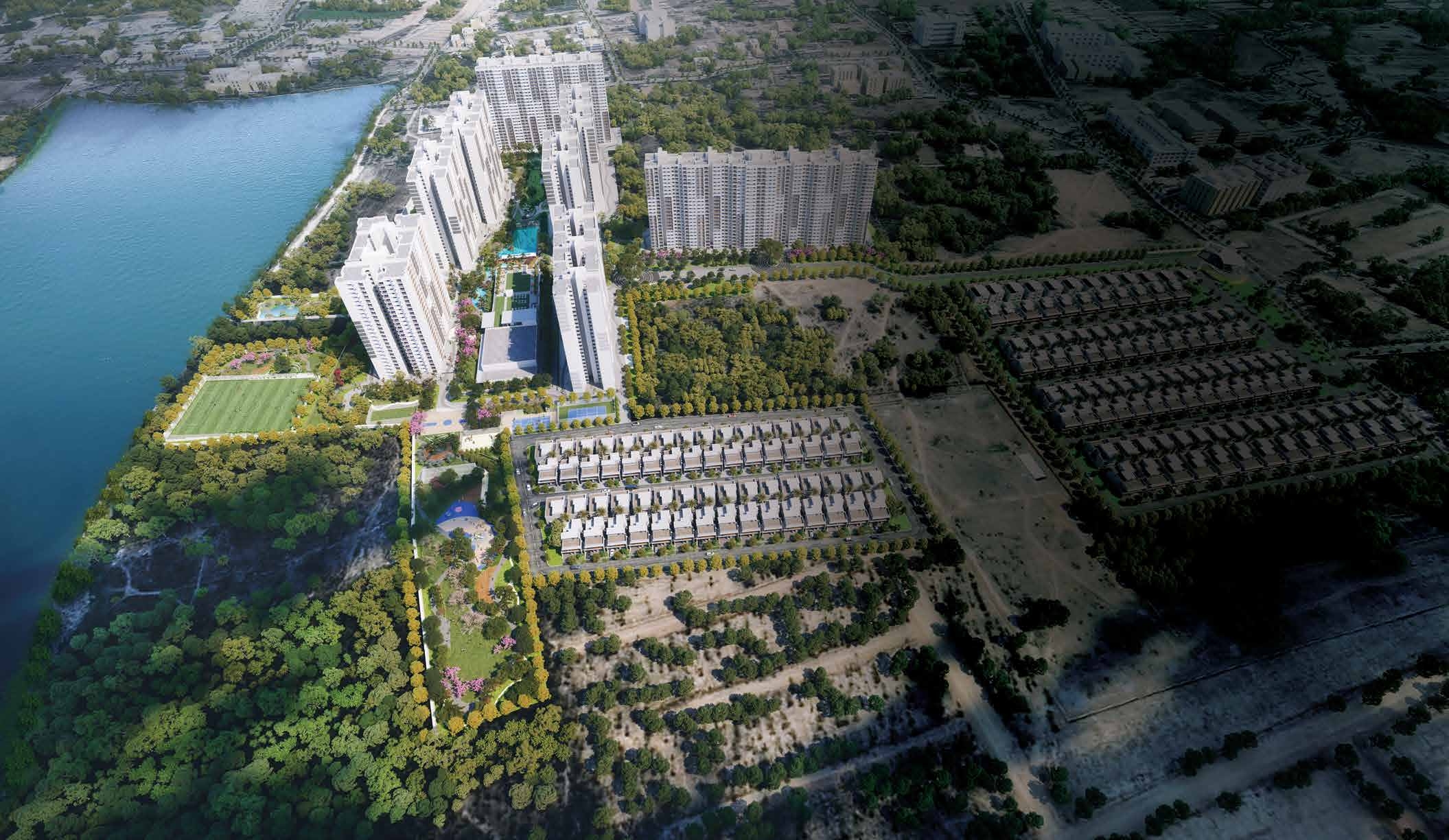 Adarsh Welkin Park Phase 2, Sky Residencies, nestled along the serene banks of Gattihalli Lake, offer a harmonious blend of modern living amidst lush greenery and fresh air. The architectural design of the apartment captures a sense of verticality, seamlessly connecting the heavens and the earth. Embracing simplicity, clean lines, and framed color accents, the façade draws inspiration from nature, transitioning from earthy tones of grey and bronze to the pristine white of the sky. The building's exterior effortlessly integrates with the natural surroundings, harmonizing with the courtyard greenery a